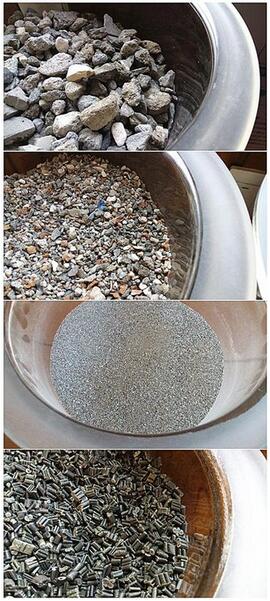 回收后的裝修垃圾,通過機器分揀處理,可以生產(chǎn)出不同的原料,自上而下,依次是:大顆粒骨料、小顆粒骨料、粉末骨料和塑料顆粒