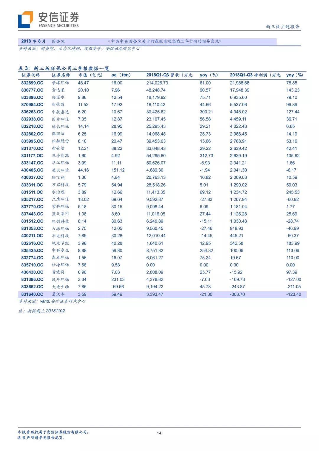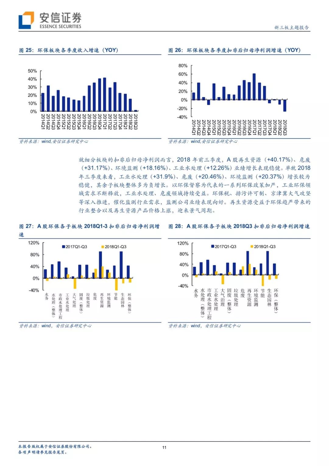 從政策進(jìn)展看環(huán)境變遷路徑,環(huán)境治理已經(jīng)實(shí)現(xiàn)圍繞大氣+水+土壤三大維度建立起“環(huán)保稅+排污許可證”兩大保障、從城市走向農(nóng)村的一體化大環(huán)保格局。自年初環(huán)保稅、排污許可證實(shí)施以來(lái),政策力度不減且頻頻出臺(tái),在肯定我國(guó)環(huán)境治理已取得階段性的勝利的同時(shí),進(jìn)行大氣、水、固廢、土壤等細(xì)分領(lǐng)域的深化推進(jìn)。我們對(duì)于2018年以來(lái)各細(xì)分板塊政策及變遷進(jìn)行了梳理。而新三板擁有400家公司,覆蓋了大氣治理、水治理、固廢治理等各個(gè)領(lǐng)域。我們繼續(xù)看好環(huán)保板塊,建議從政策推進(jìn)進(jìn)程中發(fā)掘潛在機(jī)會(huì),建議關(guān)注水治理、固廢治理和再生資源板塊投資機(jī)會(huì)。
