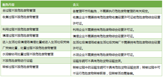 注:上表依據(jù)《危險(xiǎn)廢物豁免管理清單》及《環(huán)境資源犯罪實(shí)務(wù)精釋》(喻海松著,2017年1月版,法律出版社,P136~137)編輯、整理