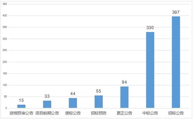 11月上旬(11月1日-10日)全國各地共發(fā)布環(huán)衛(wèi)運營類項目公開招標(biāo)采購信息968個,其中:項目前期公告33個,招標(biāo)預(yù)告55個,招標(biāo)公告397個,資格預(yù)審公告15個,更正公告94個,中標(biāo)公告330個,廢標(biāo)及流標(biāo)公告44個。