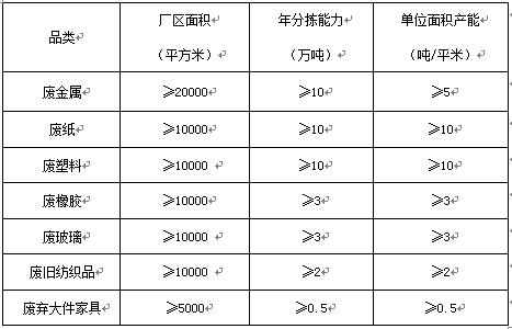 指分揀品類不少于二類,分揀能力和用地面積規(guī)劃設(shè)計(jì),應(yīng)以再生資源分揀用地標(biāo)準(zhǔn)和本區(qū)域再生資源實(shí)際產(chǎn)生量為準(zhǔn)。可分為大、中、小型三個(gè)級(jí)別,各級(jí)別綜合型分揀中心的年分揀能力和廠區(qū)面積如下: