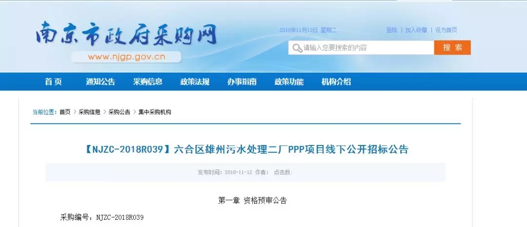 11月13日,從南京市政府采購網(wǎng)獲悉,六合區(qū)雄州污水處理二廠PPP項目發(fā)布招標公告,總投資62097.17萬元。