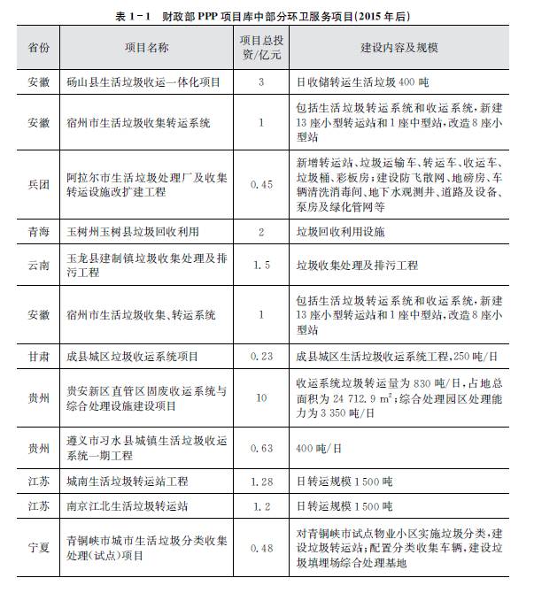 2015年開(kāi)始,PPP模式在各地公用市政行業(yè)全面展開(kāi),業(yè)內(nèi)人士稱之為PPP元年。伴隨整個(gè)市場(chǎng)大環(huán)境,環(huán)衛(wèi)服務(wù)行業(yè)的市場(chǎng)化也已經(jīng)大幕開(kāi)啟,越來(lái)越多的環(huán)衛(wèi)領(lǐng)域的項(xiàng)目開(kāi)始公開(kāi)招標(biāo)。各地開(kāi)始出現(xiàn)一些分包作業(yè)或者環(huán)衛(wèi)一體化PPP項(xiàng)目,包含垃圾清運(yùn)、道路清掃、設(shè)施維護(hù)等環(huán)衛(wèi)作業(yè)內(nèi)容,或打包招標(biāo)。較為典型的是2015年??谑协h(huán)衛(wèi)一體化建設(shè)全面引入PPP模式項(xiàng)目,4個(gè)區(qū)分別由北京環(huán)衛(wèi)集團(tuán)、龍馬環(huán)衛(wèi)和深圳玉禾田公司中標(biāo)。2015年財(cái)政部建立的PPP項(xiàng)目庫(kù)中首次出現(xiàn)了17個(gè)環(huán)衛(wèi)項(xiàng)目,總規(guī)模約42億元,主要以垃圾清運(yùn)項(xiàng)目為主。截至目前通過(guò)2015年財(cái)政部建立的PPP項(xiàng)目庫(kù)檢索生活垃圾相關(guān)的PPP項(xiàng)目,有多達(dá)202條項(xiàng)目記錄,包含生活垃圾清運(yùn)、轉(zhuǎn)運(yùn)、分揀、終端處理設(shè)施新建和改擴(kuò)建等項(xiàng)目。