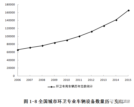 2015年全國(guó)城市環(huán)衛(wèi)專用車(chē)輛設(shè)備總數(shù)達(dá)到165725臺(tái)(輛),比2014年增加24294臺(tái)(輛),增長(zhǎng)率達(dá)到17.18%。2006至2015年的10年期間,環(huán)衛(wèi)專用車(chē)輛總數(shù)平均年增長(zhǎng)率達(dá)到8.51%,持續(xù)保持高速增長(zhǎng)。