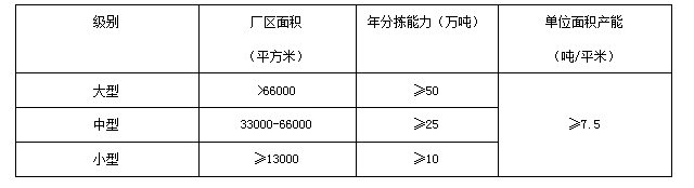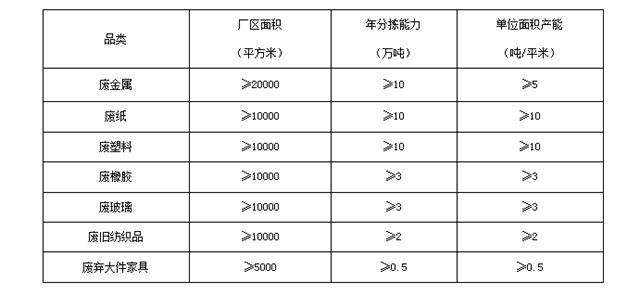 指分揀品類不少于二類,分揀能力和用地面積規(guī)劃設(shè)計(jì),應(yīng)以再生資源分揀用地標(biāo)準(zhǔn)和本區(qū)域再生資源實(shí)際產(chǎn)生量為準(zhǔn)。可分為大、中、小型三個(gè)級(jí)別,各級(jí)別綜合型分揀中心的年分揀能力和廠區(qū)面積如下: