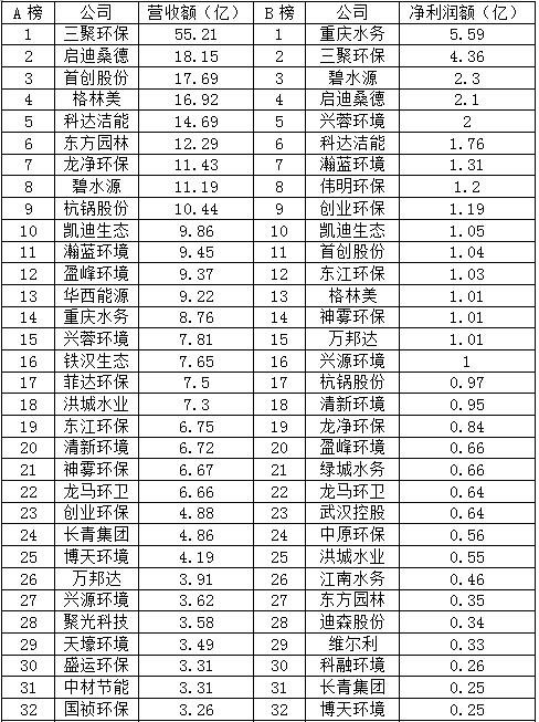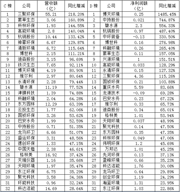 2017年多數(shù)環(huán)保上市企業(yè)一季度報(bào)告顯示贏得開門紅,同期均有所增長(zhǎng),僅四家表示營(yíng)業(yè)收入同期下降。不過凈利潤(rùn)7家為虧損狀態(tài), 15家同期下降。以下A榜為營(yíng)業(yè)收入排行榜,B榜為凈利潤(rùn)排行榜。C榜為營(yíng)業(yè)收入同比增長(zhǎng)率排行榜,D榜為凈利潤(rùn)同比增長(zhǎng)率排行榜。