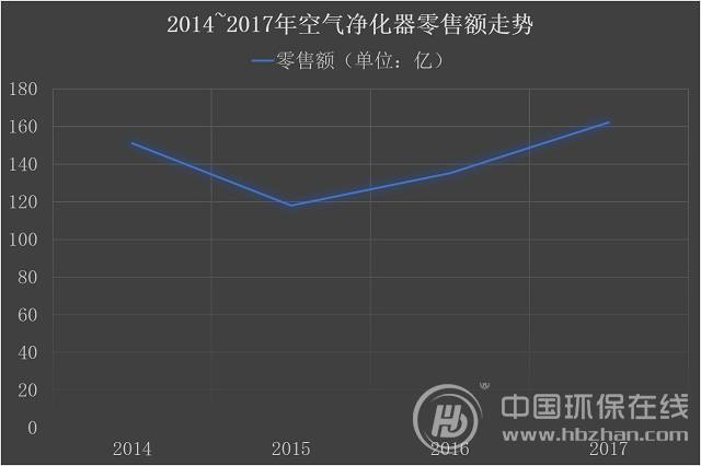 折射至市場層面,奧維云網(wǎng)大數(shù)據(jù)顯示,空氣凈化器的零售規(guī)模在2014年零售額為151億元,同比增長94.8%;2015年零售額為118億元,同比下降21.6%;2016年零售額為135.1億元,同比增長14.1%;2017年零售額為162.1億元,同比增長20%。