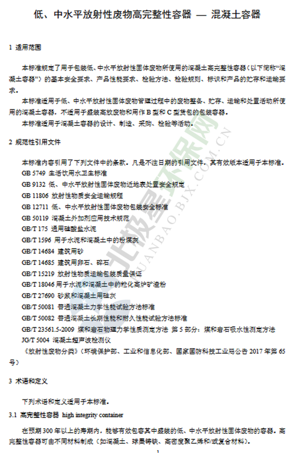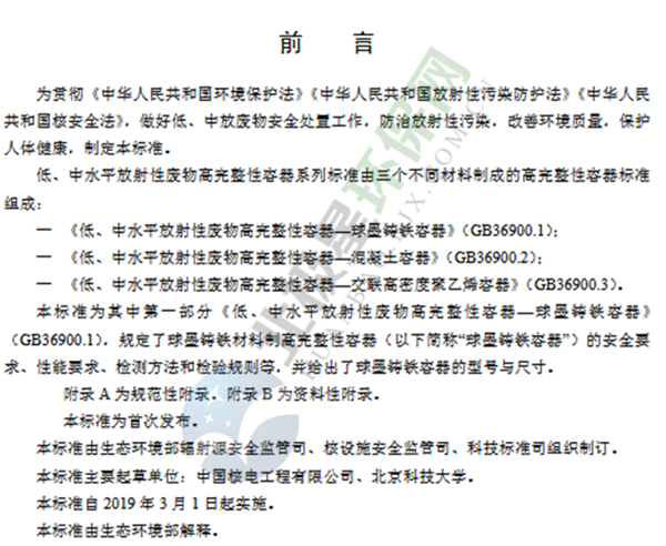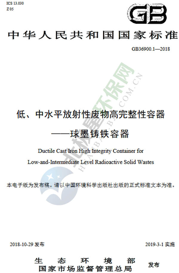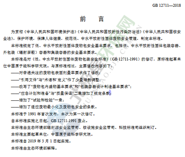 上述標準自2019年3月1日起實施,自實施之日起,《低、中水平放射性固體廢物包安全標準》(GB 12711-1991)廢止。