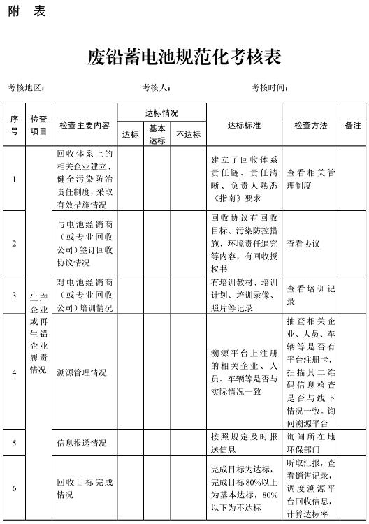 (三)加強督導考評。建立健全督導檢查、考核評價機制,加強對四個試點市廢鉛蓄電池回收處理體系建設(shè)情況的檢查考核,發(fā)現(xiàn)問題及時督查督辦,不斷修訂、完善制度,推動建立規(guī)范、高效、暢通的回收利用體系。