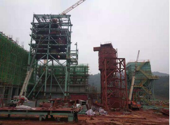 2、煙氣處理:收塵器頂部平臺組拼完,電動葫蘆吊架組拼安裝就位;反應(yīng)塔直筒焊接,頂頂部電動葫蘆吊架吊裝就位;消石灰鋼構(gòu)拼裝完,筒體安裝,平臺鋼構(gòu)安裝;
