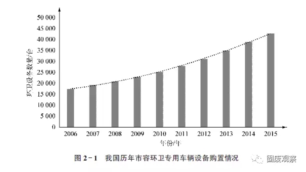 據(jù)國家統(tǒng)計(jì)局統(tǒng)計(jì),截至2015年年底,我國城鎮(zhèn)化率已經(jīng)達(dá)到56.1%。且目前正以年均1個百分點(diǎn)的速度增長。2015年,全國市容環(huán)衛(wèi)專用車輛設(shè)備共42702臺,同比增加3789臺,如圖2-1所示。