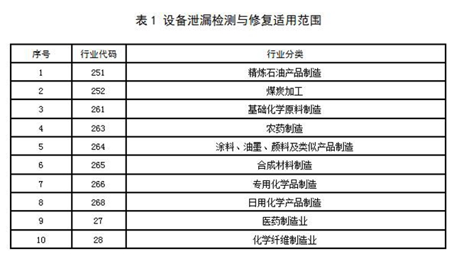 本規(guī)范規(guī)定了設(shè)備泄漏檢測(cè)與修復(fù)的實(shí)施范圍、技術(shù)方法等要求。本規(guī)范適用于本市表 1中所列行業(yè)企業(yè)含涉揮發(fā)性有機(jī)物物料設(shè)備的泄漏排放管理。