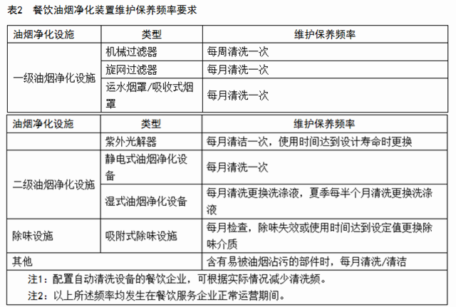 7.3 油煙凈化設(shè)施維護(hù)保養(yǎng)頻率按表2的規(guī)定。