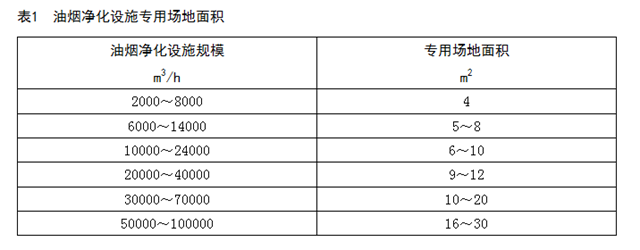 6.3.1 二級(jí)油煙凈化設(shè)施、除味設(shè)施、排風(fēng)機(jī)和排氣筒等應(yīng)安裝在凈高不低于1.5 m的專用場(chǎng)地內(nèi),并在維護(hù)側(cè)留有不少于0.45 m的作業(yè)距離。油煙凈化設(shè)施專用場(chǎng)地預(yù)留面積參見表1。
