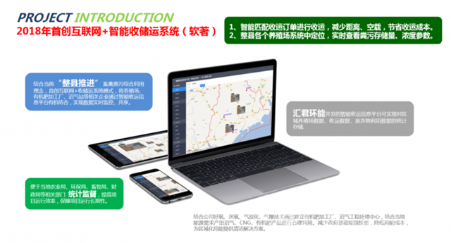 國(guó)家從2008年開(kāi)始開(kāi)始關(guān)注畜禽處理,2017年已經(jīng)開(kāi)始形成規(guī)?;6鴧R君環(huán)能同時(shí)也從去年開(kāi)始著手規(guī)劃整縣(市)資源化的處理,利用匯君模式,根據(jù)當(dāng)?shù)氐膶?shí)際情況,合理規(guī)劃沼氣工程中心站,另外以村鎮(zhèn)為單位、以公里半徑為單位、以養(yǎng)殖規(guī)模為單位,建立有機(jī)肥加工廠,采用智能化收儲(chǔ)運(yùn)平臺(tái),有效利用地方的政策,配合消納政策,實(shí)現(xiàn)全方位畜禽糞污資源化智能處理。