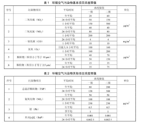 第4.2條:環(huán)境空氣功能區(qū)質(zhì)量要求:一類區(qū)適用一級(jí)排放濃度限值,二類區(qū)適用二級(jí)濃度排放限值。一、二類區(qū)環(huán)境空氣功能區(qū)質(zhì)量要求見(jiàn)表1和表2: