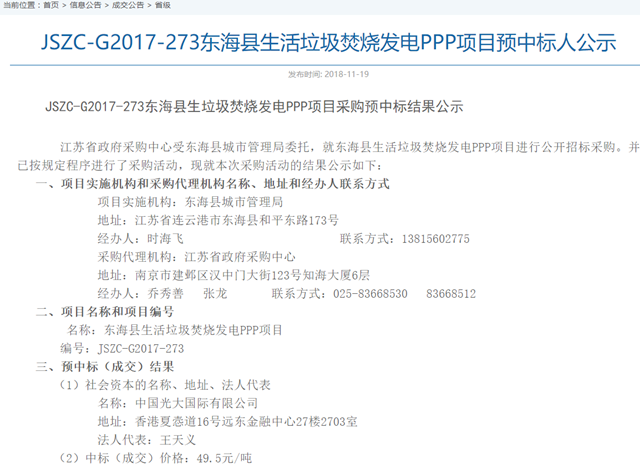 2018年11月19日,江蘇東海縣1200噸/日的生活垃圾焚燒項目評標(biāo)工作結(jié)束,光大國際成為預(yù)中標(biāo)社會資本方,成交價格49.5元/噸。