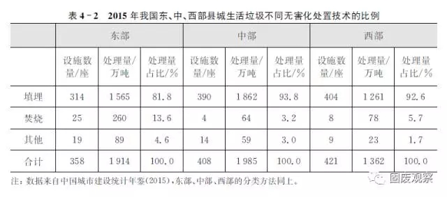 由表4-2可知,2015年我國(guó)東部地區(qū)填埋比例是81.8%,中部和西部地區(qū)填埋比例更高,分別是93.8%和92.6%,表明填埋仍然在縣城區(qū)域垃圾處理中占據(jù)著絕對(duì)主力位置。
