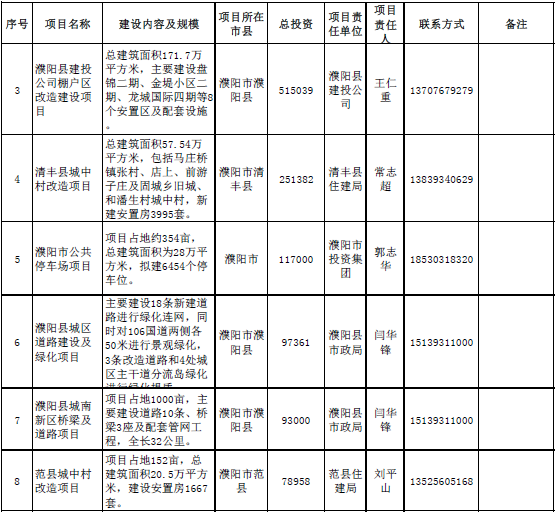 城市建設(shè)領(lǐng)域項目11個,總投資2564340萬元,主要包括濮陽市公共停車場項目、濮陽市旅游集散中心建設(shè)項目、濮陽縣城投公司棚戶區(qū)改造建設(shè)項目、清豐縣城中村改造項目等。