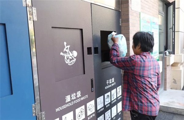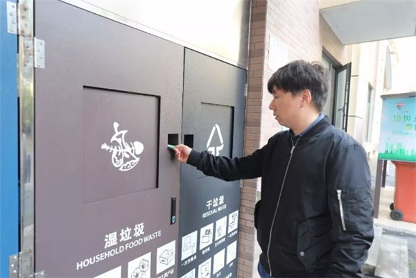 居民張先生將一袋干垃圾拎到小區(qū)門(mén)口的垃圾廂旁,刷卡后,垃圾房的干垃圾投放窗口緩緩打開(kāi),張先生將垃圾投放進(jìn)去后,綠色賬戶積分也增加了10分。