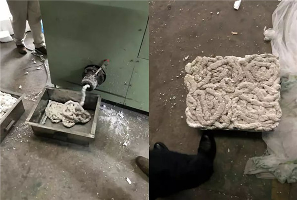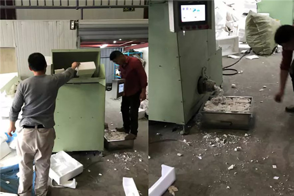 當(dāng)?shù)貙?zhuān)家發(fā)明壓縮泡沫塑料機(jī)器,從機(jī)器口投入泡沫塑料,經(jīng)過(guò)低溫融化重新壓縮體積。