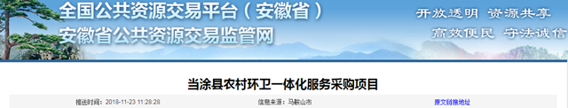 2018年11月23日,安徽省馬鞍山市當(dāng)涂縣農(nóng)村環(huán)衛(wèi)一體化服務(wù)采購(gòu)項(xiàng)目發(fā)布招標(biāo)公告。