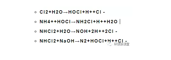 折點加氯法處理后的出水在排放前一般需要用活性碳或二氧化硫進(jìn)行反氯化,以去除水中殘留的氯。1mg殘留氯大約需要0.9~1.0mg的二氧化硫。在反氯化時會產(chǎn)生氫離子,但由此引起的pH值下降一般可以忽略,因此去除1mg殘留氯只消耗2mg左右(以CaCO3計)。折點氯化法除氨機(jī)理如下: