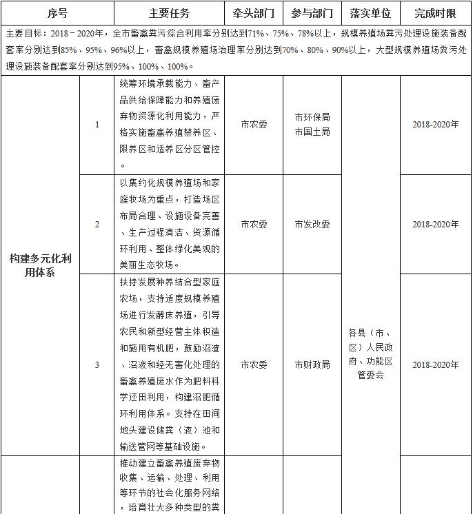 (二)主要目標(biāo)。到2019年,大型規(guī)模養(yǎng)殖場(chǎng)糞污處理設(shè)施裝備配套率達(dá)到100%;到2020年,建立科學(xué)規(guī)范、權(quán)責(zé)清晰、約束有力的畜禽養(yǎng)殖廢棄物資源化利用體系,構(gòu)建種養(yǎng)循環(huán)發(fā)展機(jī)制,全市畜禽糞污綜合利用率達(dá)到78%以上,規(guī)模養(yǎng)殖場(chǎng)糞污處理設(shè)施裝備配套率達(dá)到96%以上,規(guī)模養(yǎng)殖場(chǎng)治理率達(dá)到90%以上。