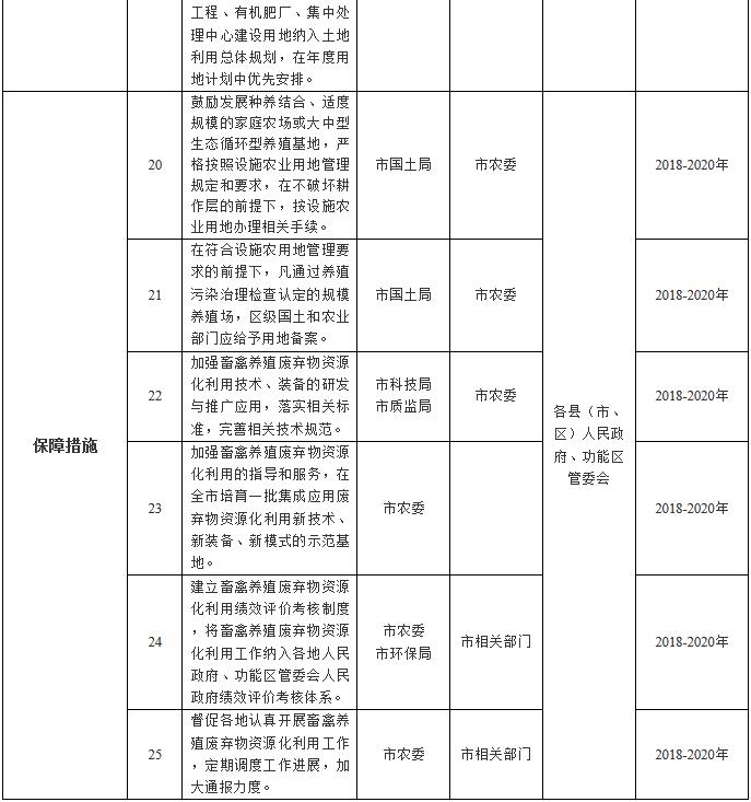 (九)堅(jiān)持屬地責(zé)任管理。畜禽養(yǎng)殖廢棄物資源化利用實(shí)行屬地管理責(zé)任制,各地人民政府、功能區(qū)管委會(huì)對(duì)本行政區(qū)域內(nèi)的畜禽養(yǎng)殖廢棄物資源化利用工作負(fù)總責(zé),強(qiáng)化組織領(lǐng)導(dǎo),明確部門職責(zé),建立協(xié)調(diào)機(jī)制,加強(qiáng)政策扶持,強(qiáng)化日常監(jiān)管,健全督查制度和巡查機(jī)制,確保各項(xiàng)任務(wù)落實(shí)到位。堅(jiān)持保供給與保生態(tài)并重,落實(shí)“菜籃子”市長(zhǎng)負(fù)責(zé)制,統(tǒng)籌環(huán)境保護(hù)與畜牧業(yè)協(xié)調(diào)發(fā)展。各縣(市、區(qū))人民政府、功能區(qū)管委會(huì)應(yīng)于2018年10月底前制訂并公布畜禽養(yǎng)殖廢棄物資源化利用工作方案,細(xì)化年度重點(diǎn)任務(wù)和工作清單,抄送市農(nóng)委,并報(bào)省農(nóng)委備案。