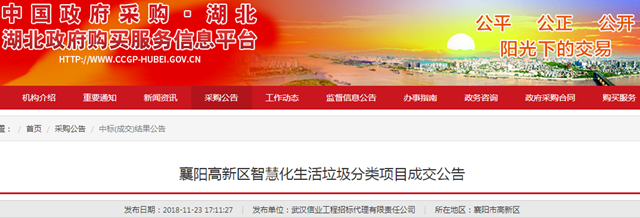 湖北襄陽(yáng)高新區(qū)智慧化生活垃圾分類(lèi)項(xiàng)目成交公告,浙江聯(lián)運(yùn)環(huán)境工程股份有限公司成為中標(biāo)的社會(huì)資本方,中標(biāo)金額為61.3萬(wàn),服務(wù)期限為1年。