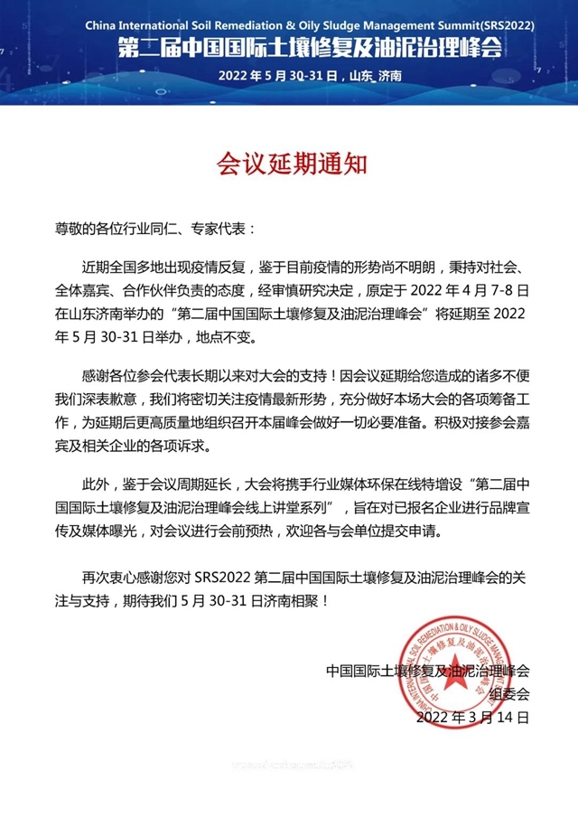 尊敬的各位行業(yè)同仁、專家代表: 鑒于近期疫情波及多個(gè)省市疫情形勢(shì)仍未明朗,秉持對(duì)社會(huì)、全體嘉賓、合作伙伴負(fù)責(zé)的態(tài)度,經(jīng)審慎研究決定,原定于 2022 年 5月 30-31日在山東濟(jì)南舉辦的“第二屆中國(guó)國(guó)際土壤修復(fù)及油泥治理峰會(huì)”將延期至 2022年8月(具體時(shí)間待定)舉辦,地...