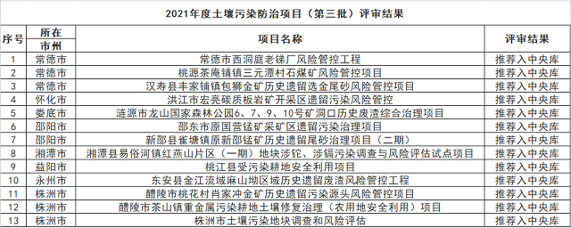 湖南省生態(tài)環(huán)境廳關(guān)于2021年度土壤污染防治項(xiàng)目(第三批)、地下水污染防治項(xiàng)目(第二批)評審結(jié)果的公示 根據(jù)《土壤污染防治專項(xiàng)資金管理辦法》、《關(guān)于印發(fā)<中央生態(tài)環(huán)境資金項(xiàng)目儲(chǔ)備庫入庫指南>的通知》、《湖南省省級財(cái)政專項(xiàng)資金公開辦法(試行)》等有關(guān)要求,經(jīng)項(xiàng)目單位申請、市級環(huán)保部門審查、...