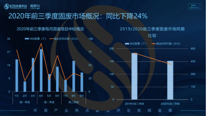市場走勢:固廢市場項目建設(shè)投資總額較2019年同期下降24% 據(jù)E標通獲悉,2020年前三季度共計釋放固廢項目150余個,建設(shè)投資總額約420億元。左圖為2020年前三季度每月固廢項目中標情況,4月固廢項目的釋放量最多,建設(shè)投資總額最大(91.4億元)。與2019年同期相比(右圖),2020年前三季...