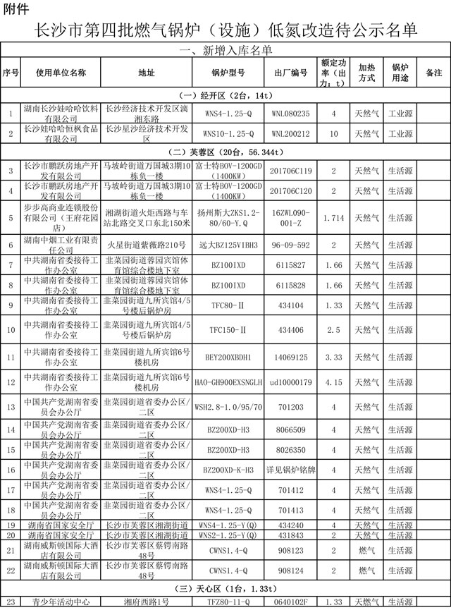 2020年6月,根據(jù)《長沙市燃氣鍋爐(設施)低氮改造工作補充通知》要求,市藍天辦進行了第四批次燃氣鍋爐(設施)低氮改造待公示名單征集,經(jīng)各區(qū)縣上報統(tǒng)計,此批次共減少29臺鍋爐、蒸噸數(shù)下調(diào)94.486蒸噸,調(diào)整鍋爐用途3臺(3蒸噸)(詳見附件),最終確定全市應改造鍋爐為1144臺(具體詳見附件)。 附...