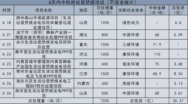 中國(guó)固廢網(wǎng)從E20環(huán)境平臺(tái)標(biāo)訊采集系統(tǒng)(信息來(lái)源:全國(guó)各級(jí)政府采購(gòu)網(wǎng)/公共資源交易平臺(tái))獲悉,4月18日至4月26日的8天內(nèi),已有8個(gè)垃圾焚燒項(xiàng)目敲定了(預(yù))中標(biāo)的社會(huì)資本方,包括綠色動(dòng)力、三峰環(huán)境、城發(fā)環(huán)境、康恒環(huán)境、中國(guó)環(huán)保、高能環(huán)境在內(nèi)的企業(yè)都分得了焚燒市場(chǎng)的“一杯羹”...