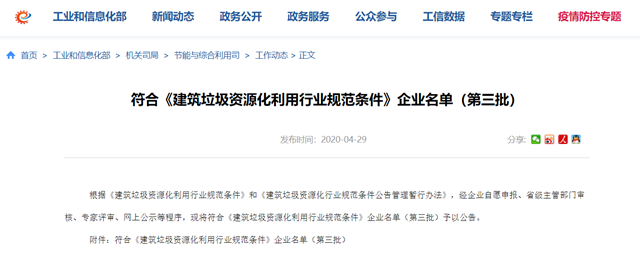 日前,工信部發(fā)布符合《建筑垃圾資源化利用行業(yè)規(guī)范條件》企業(yè)名單(第三批)。共涉及五家企業(yè)。 中華人民共和國(guó)工業(yè)和信息化部 中華人民共和國(guó)住房和城鄉(xiāng)建設(shè)部公告 2020年 第14號(hào) 根據(jù)《建筑垃圾資源化利用行業(yè)規(guī)范條件》和《建筑垃圾資源化行業(yè)規(guī)范條件公告管理暫行辦法》,經(jīng)企業(yè)自愿申報(bào)、省級(jí)主管部門審核...