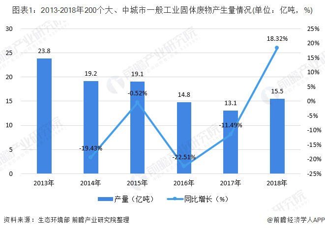 一般工業(yè)固廢的產量占比在固廢廢物總量八成以上,一般工業(yè)固廢的產量趨勢幾乎決定著固廢的整體走向。近年來,一般工業(yè)固廢的貯存待處理量上漲較快,截至2018年底200個大、中城市一般工業(yè)固體廢物貯存量達到8.1億噸。 一般工業(yè)固體廢棄物產量有所回升 工業(yè)固廢處理是我國固廢處理行業(yè)的重要組成部分,工業(yè)固廢分...