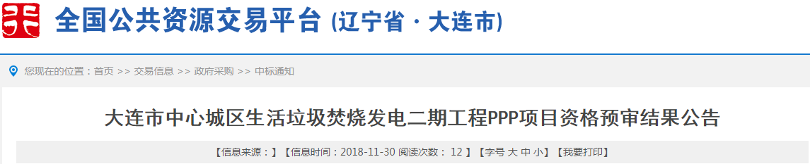 11月30日,遼寧省大連市中心城區(qū)生活垃圾焚燒發(fā)電二期工程PPP項(xiàng)目發(fā)布資格預(yù)審結(jié)果公告。 入圍的企業(yè)包括: 瀚藍(lán)環(huán)境股份有限公司、 重慶三峰環(huán)境集團(tuán)股份有限公司(聯(lián)合體成員:中冶焦耐(大連)工程技術(shù)有限公司)、 浙江偉明環(huán)保股份有限公司、 中國環(huán)境保護(hù)集團(tuán)有限公司、 中電國際新能源控股有限公司、 ...