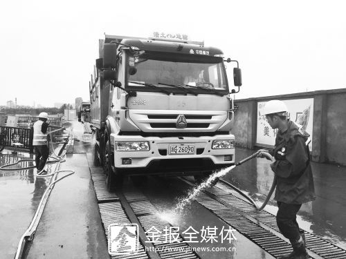 每輛運輸車駛出工地出口前,先要從過水池過水,在過水池中接受自動噴淋全方位沖洗,再駛?cè)霙_洗平臺,工人用高壓水槍,對輪胎、車廂凹槽、縫隙等部位再次沖洗,確保車輛凈車出場。9月15日,記者在位于市區(qū)東市街與宋濂路交叉口的多湖商務(wù)區(qū)塊某工程施工現(xiàn)場看到了上述一幕?!拔覀円筮@樣做的目的,是為了防止車污染城市...