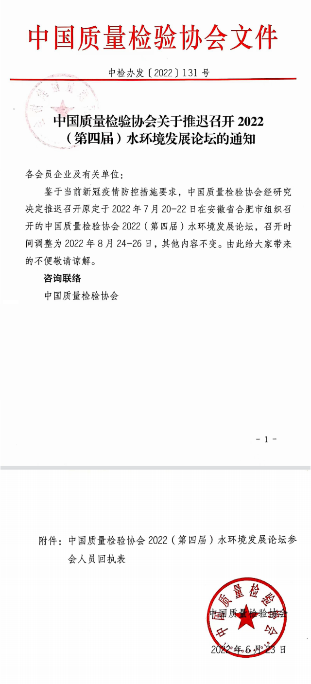中國質量檢驗協(xié)會關于推遲召開2022(第四屆)水環(huán)境發(fā)展論壇的通知各會員企業(yè)及有關單位: 鑒于當前疫情防控措施要求,中國質量檢驗協(xié)會經(jīng)研究決定推遲召開原定于2022年7月20-22日在安徽省合肥市組織召開的中國質量檢驗協(xié)會2022(第四屆)水環(huán)境發(fā)展論壇,召開時間調整為2022年8月24-26日,其...