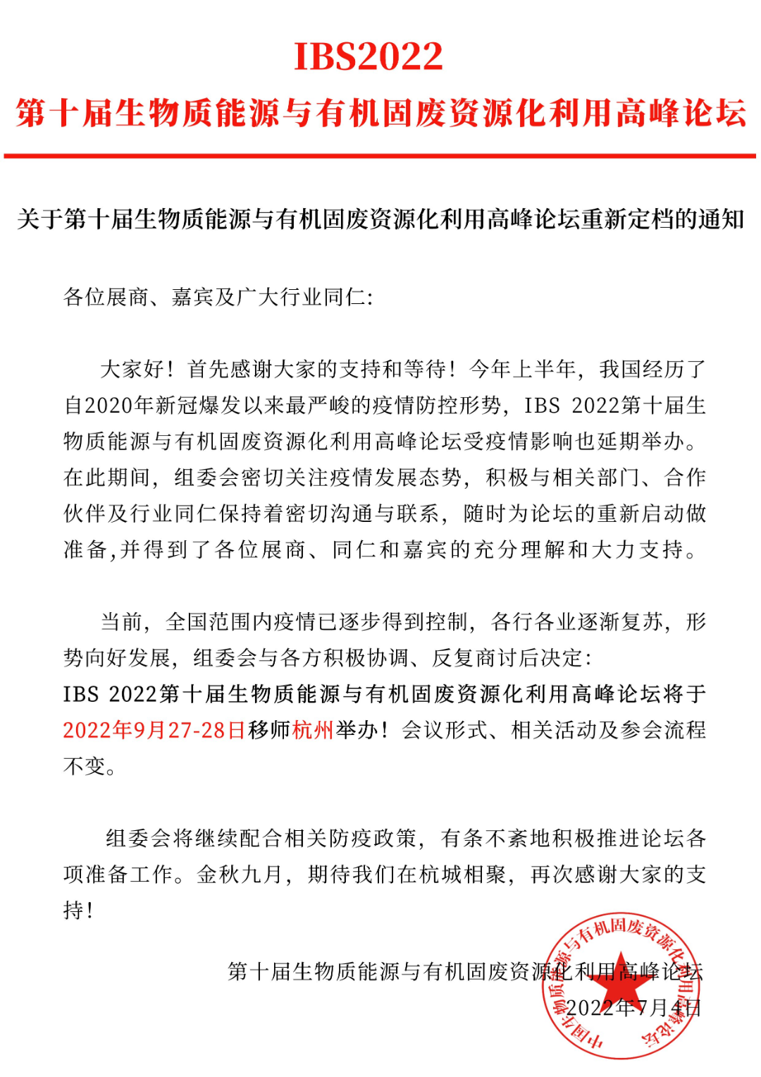 各有關單位、參會代表: 鑒于當前疫情防控形勢仍較嚴峻復雜,為積極配合國家和地方防控要求,最大限度降低疫情傳播風險,切實保障與會人員的健康安全,確保大會的質量和效果,經(jīng)與各主辦單位協(xié)商決定:原定于2022年6月7日-9日舉辦的“2022鄉(xiāng)村振興與環(huán)境發(fā)展論壇、第二屆村鎮(zhèn)水環(huán)境治理產(chǎn)業(yè)與發(fā)展...