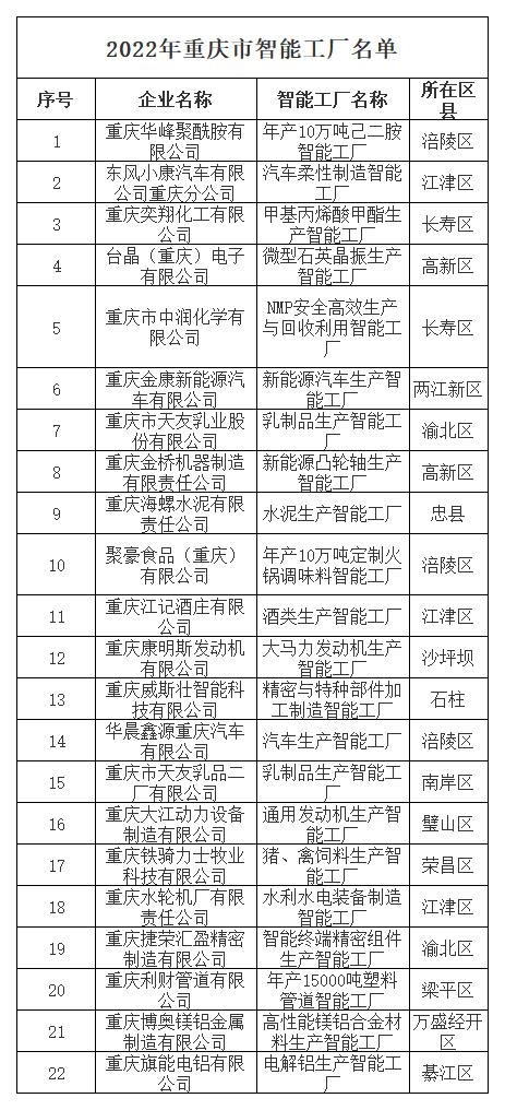 近日,重慶市經(jīng)濟和信息化委員會公布了2022年智能工廠和數(shù)字化車間名單,其中智能工廠22個,數(shù)字化車間160個。詳情如下:重慶市經(jīng)濟和信息化委員會關(guān)于公布2022年重慶市智能工廠和數(shù)字化車間名單的通知 各區(qū)縣(自治縣)經(jīng)濟信息委,兩江新區(qū)、西部科學(xué)城重慶高新區(qū)、萬盛經(jīng)開區(qū)經(jīng)信部門,有關(guān)企業(yè): 為加快...