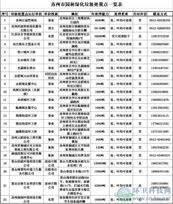 環(huán)衛(wèi)科技網(wǎng)訊,10月18日,蘇州市園林和綠化管理局在網(wǎng)上發(fā)布《蘇州市園林綠化垃圾處置點(diǎn)信息公示》,公示顯示,蘇州共有22個(gè)園林綠化垃圾處置點(diǎn)運(yùn)行單位,年處理能力達(dá)25.24余萬(wàn)噸。22個(gè)運(yùn)行單位中,有4家公司(兩家股份有限公司,兩家私營(yíng)單位)對(duì)外營(yíng)運(yùn),年處理能力總計(jì)22.2萬(wàn)噸。 下表為整理《蘇州發(fā)...