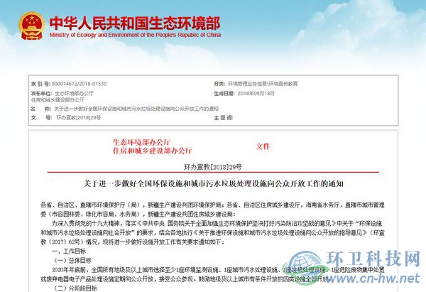 9月18日,生態(tài)環(huán)境部辦公廳與住房和城鄉(xiāng)建設(shè)部辦公廳聯(lián)合印發(fā)《關(guān)于進(jìn)一步做好全國(guó)環(huán)保設(shè)施和城市污水垃圾處理設(shè)施向公眾開放工作的通知》(以下簡(jiǎn)稱《通知》)?!锻ㄖ芬螅?020年年底前,全國(guó)所有地級(jí)及以上城市選擇至少1座環(huán)境監(jiān)測(cè)設(shè)施、1座城市污水處理設(shè)施、1座垃圾處理設(shè)施、1座危險(xiǎn)廢物集中處置或廢棄...