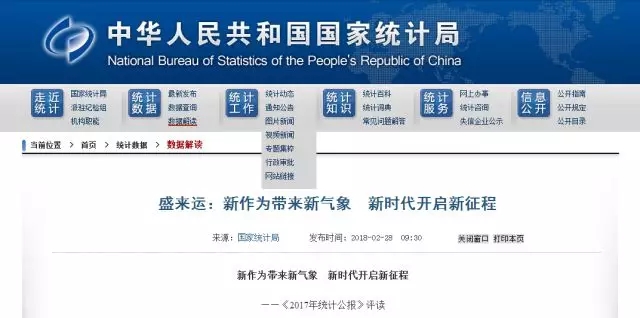 國家統(tǒng)計局網(wǎng)站28日公布《2017年國民經(jīng)濟和社會發(fā)展統(tǒng)計公報》,筆筆數(shù)據(jù)記錄了全國各族人民拼搏奮進的累累碩果,張張圖表展示了黨的十八大以來我國發(fā)展取得的歷史性成就、發(fā)生的歷史性變革。為幫助讀者更好地理解公報的豐富內涵,國家統(tǒng)計局黨組成員、總經(jīng)濟師盛來運發(fā)表了題為《新作為帶來新氣象 新時代開啟新征程...