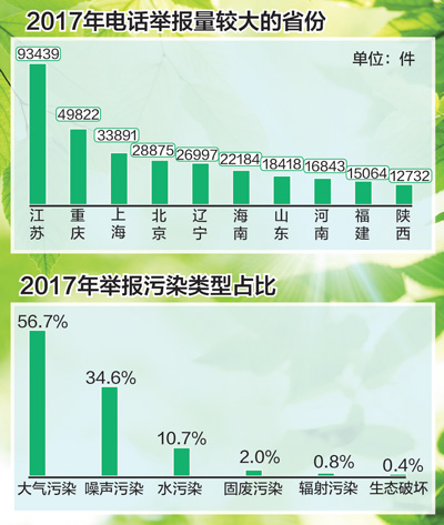 環(huán)境保護(hù)部1月23日發(fā)布通報(bào):2017年,全國環(huán)保舉報(bào)管理平臺共接到環(huán)保舉報(bào)61.89萬件,其中“12369”環(huán)保舉報(bào)熱線電話41萬件,約占66.2%,微信舉報(bào)近13萬件,約占20.9%,網(wǎng)上舉報(bào)79885件,約占12.9%。目前已辦結(jié)近59萬件,其余2.9萬件正在辦理中,環(huán)保舉報(bào)辦結(jié)率達(dá)95%。電...