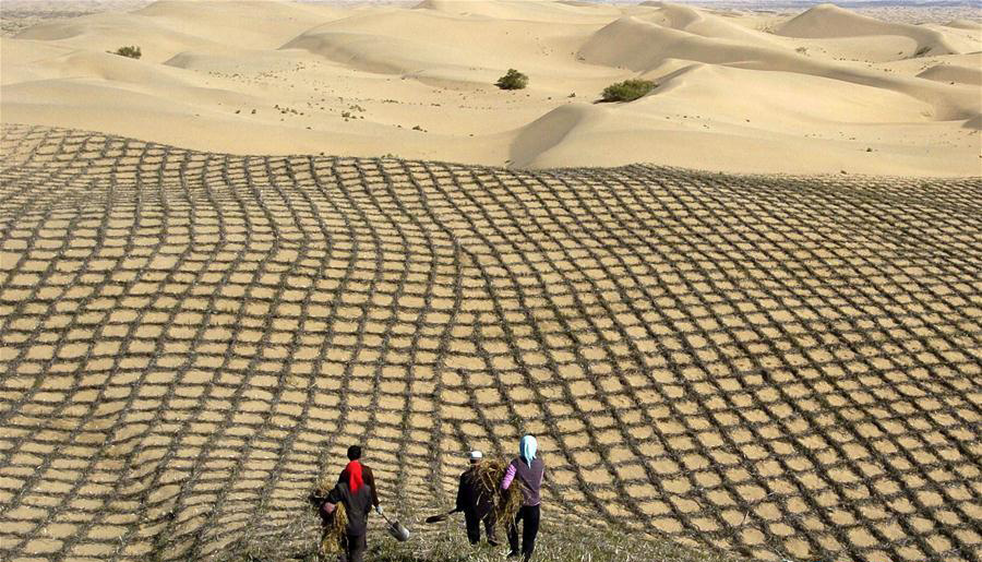 2007年10月19日 寧夏靈武市白芨灘國(guó)家級(jí)自然保護(hù)區(qū)職工扎草方格固沙。為了阻擋沙漠前進(jìn)的腳步,毛烏素沙漠西南邊緣成立了靈武市白芨灘防沙林場(chǎng)。經(jīng)過(guò)三代治沙人不懈地努力,植被覆蓋率已由最初的20%提高到如今的逾40%。2014年7月14日 寧夏彭陽(yáng)縣效果良好。據(jù)了解,寧夏中部干旱帶及南部山區(qū)開展生態(tài)...