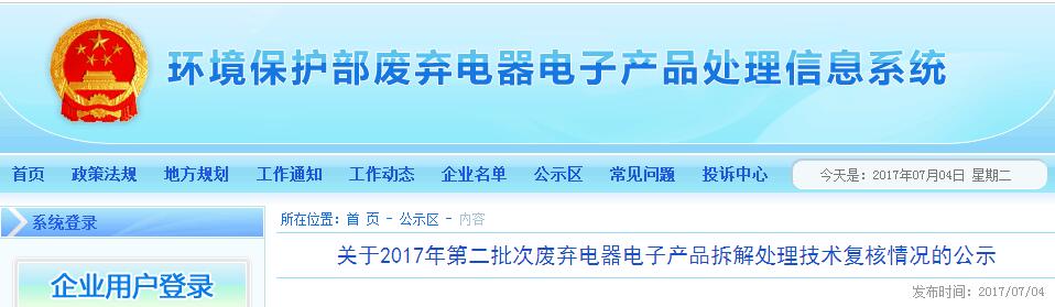 7月4日環(huán)保部環(huán)境保護(hù)部處理管理信息系統(tǒng)發(fā)布了《關(guān)于2017年第二批次廢棄電器電子產(chǎn)品拆解處理技術(shù)復(fù)核情況的公示》,具體內(nèi)容如下:關(guān)于2017年第二批次廢棄電器電子產(chǎn)品拆解處理技術(shù)復(fù)核情況的公示根據(jù)廢棄電器電子產(chǎn)品(以下簡(jiǎn)稱廢電器)拆解處理數(shù)量審核程序的有關(guān)規(guī)定,截止2017年1月底,24個(gè)省、自治...