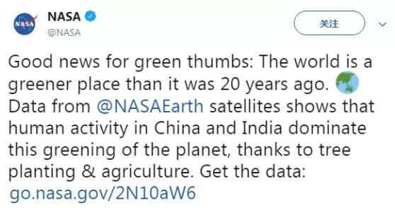 NASA稱,中國和印度的行動主導(dǎo)了地球變綠?!鳱ASA推特截圖2月12日,美國國家航空航天局(NASA)在社交媒體上發(fā)文稱,“好消息:相比20年前,世界變得更‘綠色’了。‘NASA地球’的衛(wèi)星顯示,發(fā)生在中國和印度的人類活動主導(dǎo)了這次地球變綠,感謝植樹造林和農(nóng)業(yè)種植?!盢ASA官網(wǎng)文章介紹,地球現(xiàn)在...