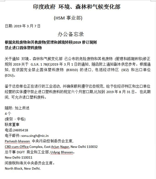 3月13日,本網(wǎng)報道了《印度宣布將全面禁止進口固體塑料廢物》?!敖沼《拳h(huán)境、森林和氣候變化部發(fā)布一份官方聲明,稱印度政府已發(fā)布禁令,禁止印度(包括經(jīng)濟特區(qū)和出口型企業(yè))進口固體塑料廢棄物。不過該聲明尚未透露這一禁令何時正式生效?!庇《日?環(huán)境、森林和氣候變化部(HSM事業(yè)部)日期:2019年3月...